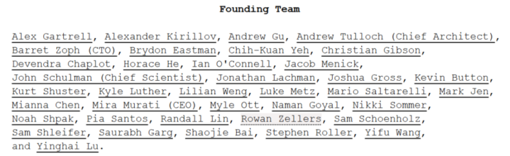 在这份创始团队名单中,有很多行业大佬。比如JohnSchulman担任首席科学家,他是深度强化学习的一位先驱研究者,创造了著名的PPO算法。同时也是OpenAI的创始人之一,曾共同领导过ChatGPT和OpenAI后训练团队。